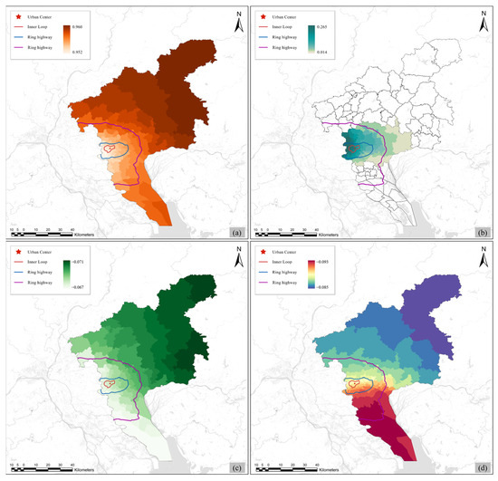 Spatial distributions of MGWR regression coefficients for logistics and the density of commercial facilities: (a) density of express service points; (b) density of convenience stores; (c) density of supermarkets; (d) density of shopping malls.