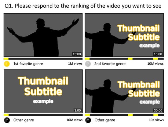 The last section used a choice experiment to examine the respondents’ preferences for video viewing and channel subscriptions on an online video platform. The thumbnails, titles, channel names, video lengths, view counts, and upload dates are displayed on YouTube before recommended videos are played. Similarly, our choice experiment considered thumbnails, view counts, video length, and genre attributes. Thumbnails were categorized based on whether they contained the corresponding creators or subtitles, which are the two most common elements found in YouTube thumbnails. While thumbnails may also include other elements, such as products or background images, text and creator images are the dominant visual cues that guide viewer attention. To ensure interpretability and design efficiency in the discrete choice experiment, we selected only two representative elements. For example, if the thumbnail only displays subtitles, we refer to it as an informative thumbnail, and if the thumbnail only shows the creator without subtitles, we call it a creator-focused thumbnail. We set the range between 1000 and 10,000,000 for the video views to accommodate a wide range. However, recognizing the potential for a non-linear effect, we presented these view counts in categories: 1000–10,000, 10,001–100,000, 100,001–1,000,000, and 1,000,001–10,000,000. This allows us to capture the diminishing marginal effects of higher view counts. We set the video lengths to 3, 6, and 15 min because the video bounce rate significantly increases at these durations [50]. Fishman [50] shows a sharp increase in bounce rates after 3 min, a further increase around 6 min, and a substantial drop-off in viewership beyond 15 min. For genre, we intended to expose the respondents’ decisions in the recommended video, as shown in Table 3. Furthermore, we included the number of advertisements inserted during video playback as an attribute from a commercial perspective. Table 4 presents a detailed explanation of the attributes and attribute levels used in the choice experiment.