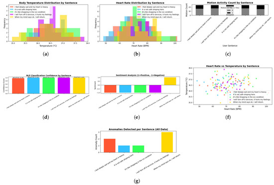 Figure 4f shows the heart rate vs. temperature scatter plot colored by sentence. The identification of patterns or anomalies within this plot can facilitate the detection of irregularities and initiate tailored health or safety interventions.