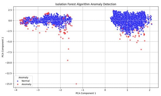 Figure 6 shows the isolation forest algorithm anomaly detection. The figure illustrates a two-dimensional PCA projection of high-dimensional features, including UMAP embeddings, comment length, and hour, to reveal patterns identified by the isolation forest model. Each point signifies a data sample, with colors indicating whether it is classified as normal (blue) or an anomaly (red).