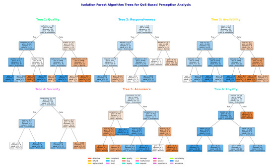 Figure 8 represents the isolation forest algorithm trees (IFAT). These trees evaluate customer perceptions based on 18 keywords derived from feedback, including terms like “refund”, “trust”, and “malfunction”. Each keyword is systematically color-coded with a six-color palette that is consistently applied across all keywords, thereby improving interpretability. The trees, constructed using a decision tree classifier, differentiate between normal and anomalous sentiments. A consolidated legend at the bottom elucidates the keyword–color associations. This visualization facilitates an understanding of how various QoS factors affect perceived service anomalies in user feedback.