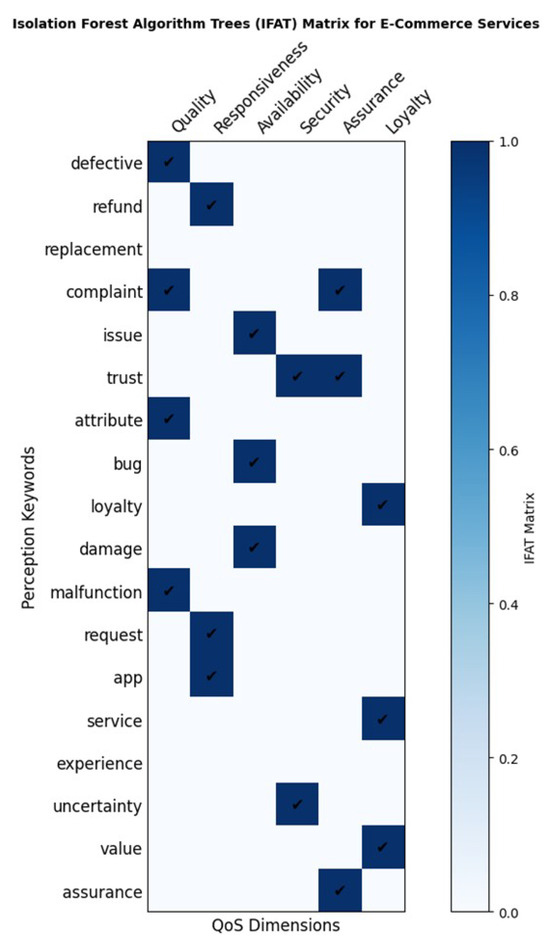 Figure 9 shows the isolation forest algorithm trees (IFAT) matrix for e-commerce services. The perception-context matrix (PCM) delivers an analysis of customer feedback in relation to the quality of service (QoS) dimensions. It is designed for the use of the isolation forest algorithm trees (IFAT) in e-commerce services.