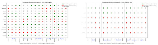 Figure 10 shows the perception component matrix (PCM) training and testing. It classifies each feedback instance as either normal (green) or anomalous (red) according to the outputs generated by the isolation forest technique. The matrix assists in identifying how perception keywords (like “bug”, “trust”, and “complaint”) influence anomaly detection in services, thereby supporting enhanced interpretability and quality monitoring through visualized associations of keywords.
