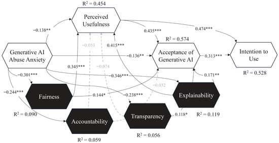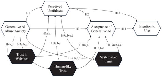 To address this limitation, we introduce trust as an alternative factor. Trust influences how individuals perceive and use technology [34,35,36]. In human–computer interaction, users may worry that the decisions made by generative AI may deviate from expectations or be misused [4]. These perceived risks often stem from users’ concerns about the control they have when using generative AI. As such, the acceptance of and willingness to use generative AI are largely related to trust [37]. Research has shown that high visibility and transparency can enhance users’ satisfaction with system performance and increase technology acceptance [17]. Fairness and accountability can further improve user satisfaction and promote continued use [5]. Vorm and Combs [38] also found that individuals’ willingness to adopt intelligent systems (such as autonomous vehicles) is primarily driven by trust in the system, rather than the simplicity of the interface. Accordingly, we replaced PEOU with a multidimensional trust framework in our model.