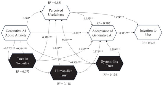 Structural model results. Trust in Websites, Human-like Trust, and System-like Trust act as predictors of Perceived Usefulness (PU), the Acceptance of Generative AI (AGAI), and the Intention to Use (ITU) it. Generative AI Abuse Anxiety (GAIA) as an exogenous factor (*: ; **: , ***: ).