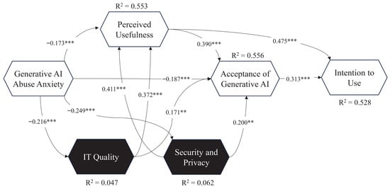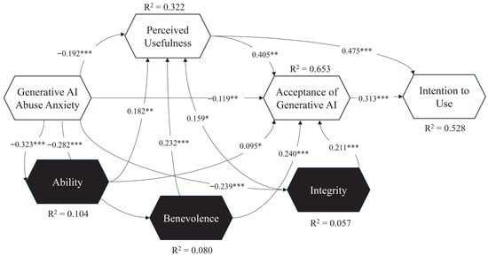 The structural model test results are presented in Figure 2 and Table 5. This study evaluated the model using path coefficients and adjusted values. Path coefficients reflect the strength of the relationships among variables, while the adjusted value indicates the model’s explanatory power. A higher value suggests a stronger explanatory power. The results show that the three trust dimensions and GAIA together account for 70.3% of the variance in Acceptance. PU and AGAI explain 52.8% of the variance in users’ ITU. This confirms the significant explanatory power of the proposed model.