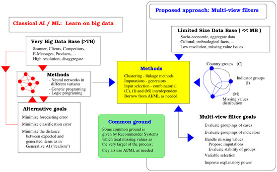 The general outline of the multi-view filter analysis of restricted and incomplete socio-economic data. This stands in contrast to the more straightforward use of AI/ML applications (left column) for huge and highly focused data sets (as routinely available to commerce, the natural sciences, and to engineering). Source: own production using xfig under Linux.
