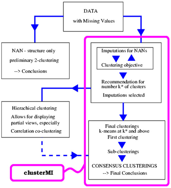- Audigier, V.; Kim, H.J. clusterMI: Cluster Analysis with Missing Values by Multiple Imputation. 2025. Available online: https://cran.r-project.org/web/packages/clusterMI/index.html (accessed on 17 April 2025).