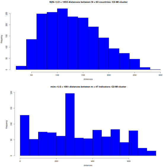 The entire set of N = 152 countries is clustered into two similarly sized clusters C1 and C2, which roughly contain less developed countries in the bigger cluster C1 and more developed countries in C2 after qualitatively characterizing these clusters in terms of their relationship to groups of indicators by using k-means clusters and correlation-based hierarchical clustering.