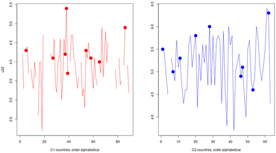 The country groupings obtained help in thinking in terms of the economic cultures and preferences. As an example of such an exercise, one may consider instances of attraction by similarity (USA and GB, say, which are both in C23) or attraction by complementarity: India and Japan, say, are in C1 and in C23, respectively; most of the C23 cluster members would cooperate with India. One may also consider repulsion by dissimilarity: India and China, say, are in C1 and C22; most of the C22 members would rather prefer to cooperate within C2. The less developed countries present in C1 tend to form a highly diverse group. Missing value occurrence is more concentrated in C1 than in C2 and, hence, accounts for a much higher percentage than that for all countries, potentially reducing the value of further sub-clustering, even if using multiple imputations as we are herein. Judging from the available digital economy data on countries from C1 (and abstracting from political goals which may override everything), it may be best to search for economic partners from some sub-clusters of C2 (the more developed countries), which are least exploitative.