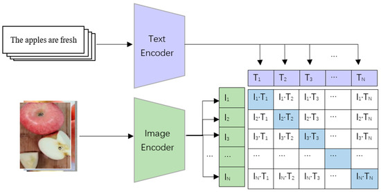 Figure 2 illustrates the text–image encoding and matching framework. Here, denotes the text features generated by the Text Encoder; each corresponds to a semantic segment of the input text (e.g., “The apples are fresh” is decomposed into multiple text feature vectors). represents the image features output by the Image Encoder, capturing distinct visual patterns of the input image (e.g., colour, shape of the apple). These features are then matched across modalities (e.g., denotes the similarity between the first image and the first text features).