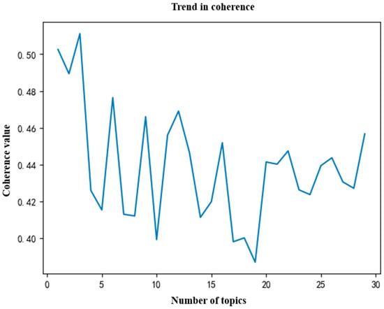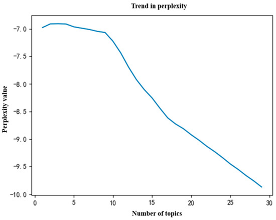 LDA models are commonly used for text clustering, but the optimal number of topics varies for each dataset. This study employed a combined strategy using perplexity and coherence to determine this parameter. Perplexity is an important metric for evaluating the effectiveness of LDA models; it generally decreases as the number of topics increases, indicating better classification accuracy [67]. However, an excessive number of topics may lead to ambiguous topic meanings and reduce interpretability. In contrast, the coherence index directly reflects classification quality, with higher values indicating stronger accuracy and reliability. Thus, this study seeks the optimal balance between perplexity and coherence to achieve effective classification and interpretability.