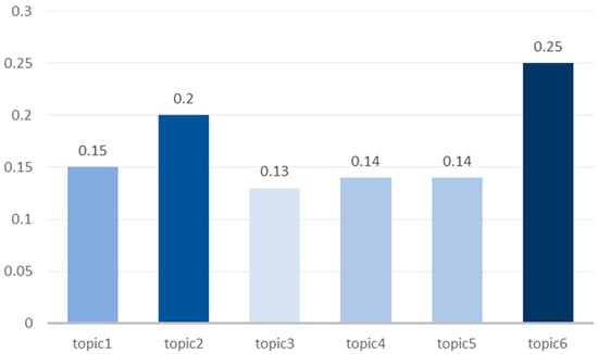 Because the logistics aspect was targeted in the data processing stage, most results were related to logistics. Table 2 presents the top ten probability factors in these six topics, and the topic names are profiled according to the top ten significant feature words in each topic. For example, the words “Fresh”, “Highly Satisfied”, and “Efficient Logistics” appear in topic1, indicating that topic1 concerns fast logistics where consumers are satisfied when fresh fruit is delivered; therefore, topic1 is named “logistics speed”, and these six topics are named according to this logic, respectively, which are designated as follows: logistics speed, praise and recommendation, compensation for logistics speed, quality defects, packaging integrity, and cost-effectiveness.