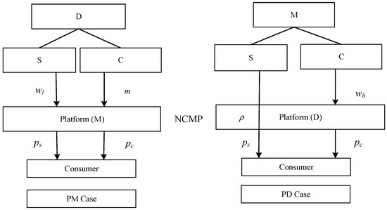 First, while earlier studies (e.g., Refs. [16,17,18]) have considered hybrid product lines involving standard and customized products, they rarely consider how the power structure and pricing authority impact the feasibility and profitability of these strategies. Our study extends this literature by modeling a dual-product strategy within an NCMP environment that features alternative leadership structures and endogenous pricing mechanisms.