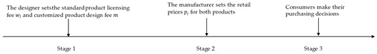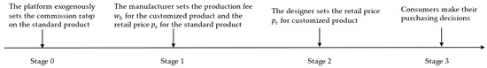 In the PD model, the manufacturer sells the standard product through the platform and collaborates with the designer to fulfill customized product orders. The sequence of events is illustrated in Figure 4. The platform first exogenously sets the commission rate () on standard product sales. Then, the manufacturer determines the production fee () for the customized product and sets the retail price () for the standard product. Subsequently, the designer sets the retail price () for the customized product. Finally, consumers make purchasing decisions.