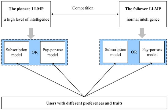 Existing literature predominantly focuses on the impact of service pricing from the cloud service enterprise perspective, with limited attention to the pricing strategies of LLMPs. While some studies explore LLMPs’ decision-making mechanisms concerning security and resource allocation [,], research addressing how users’ perceived transaction costs influence providers’ pricing model choices in oligopolistic markets remains nascent. Table 2 provides a concise comparison between existing literature and our study, highlighting our distinctive contributions. We find that the pay-per-use model offers consumers a more equitable pricing approach, thereby attracting their favor. However, its implementation simultaneously induces psychological discomfort or perceived costs among consumers. Consequently, as consumer usage frequency and psychological perceptions evolve, competitive providers dynamically adjust their pricing strategies. To address this, this paper constructs a game-theoretic model of horizontal competition between AI LLMPs with differentiated intelligence levels. The model investigates how user heterogeneity influences providers’ selection of pricing models and the formation of their equilibrium strategies.