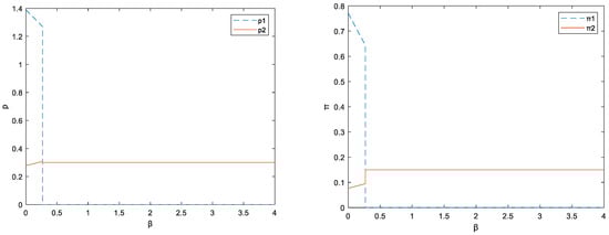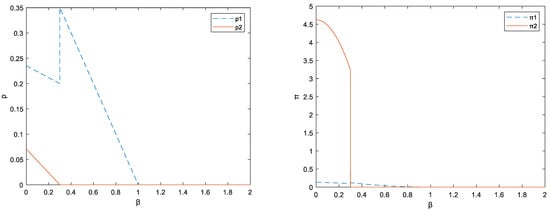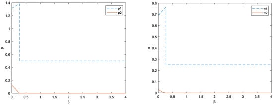 Proposition 3 indicates that the optimal decisions of both providers vary with β. When β is sufficiently small (), both providers can compete simultaneously in the market. Conversely, if β exceeds a critical threshold (), R1’s theoretically optimal price becomes negative—an economically infeasible outcome that forces its market exit. This occurs because high β values intensify users’ focus on transaction costs, leading them to perceive R1’s utility as strictly less than R2’s regardless of pricing. Consequently, users exclusively choose R2’s subscription service, aligning with the rationale in Proposition 2.