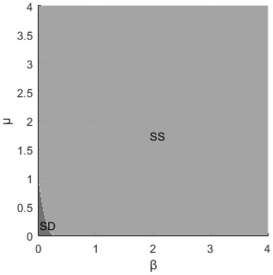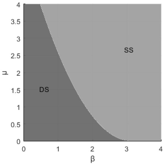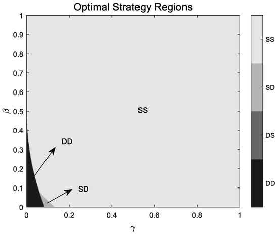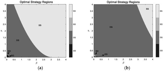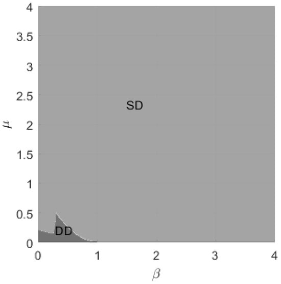 Corollary 2 reveals that in Case DS, when users’ perceived transaction cost is low (), this cost exerts diametrically opposite effects on the two providers’ pricing decisions. Specifically, the optimal price and profit for R1 (pay-per-use provider) decrease as β rises, while those for R2 (subscription provider) increase with higher β—directly contrasting the SD case. As the perceived transaction cost β increases for users purchasing R1’s pay-per-use service, its price and profit progressively decline. Meanwhile, the late-entrant R2—by adopting the subscription model—effectively avoids the impact of user psychological perception. Moreover, some users shift to R2’s service due to its significantly lower subscription price compared to R1’s in the SD case. Consequently, R2’s price and profit further rise as R1 exits the market. This demonstrates that the “tick-tock effect” imposes significant negative impacts on pay-per-use providers. Consequently, providers must carefully weigh the trade-offs of adopting pay-per-use models before finalizing their decisions. Figure 3 offers intuitive visualization of these dynamics.