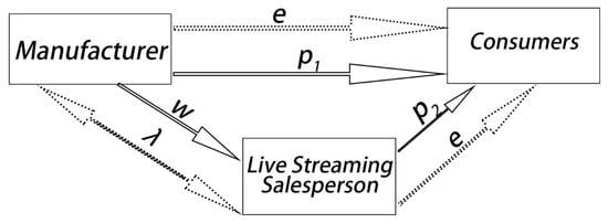 Direct channels, , denotes the sales volume attributed to live streamers, stands for the total market size, and captures customers’ price sensitivity coefficient. According to the basic model, we can see that sales volume is intrinsically linked to the sales price. In addition, this paper sets the wholesale price of each unit product to . For the convenience of calculation, this paper sets the sales price of the manufacturer as and the sales price of the live streaming salesperson as .