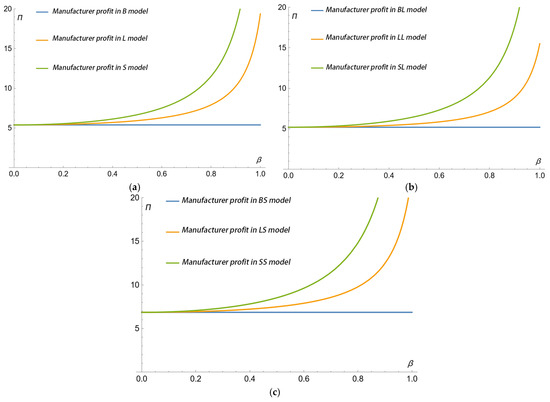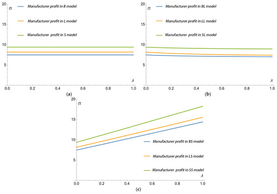 In the B, BL, and BS models, has a positive impact on , , and . In the BL model, has a positive impact on , and has a negative impact on manufacturer profits.