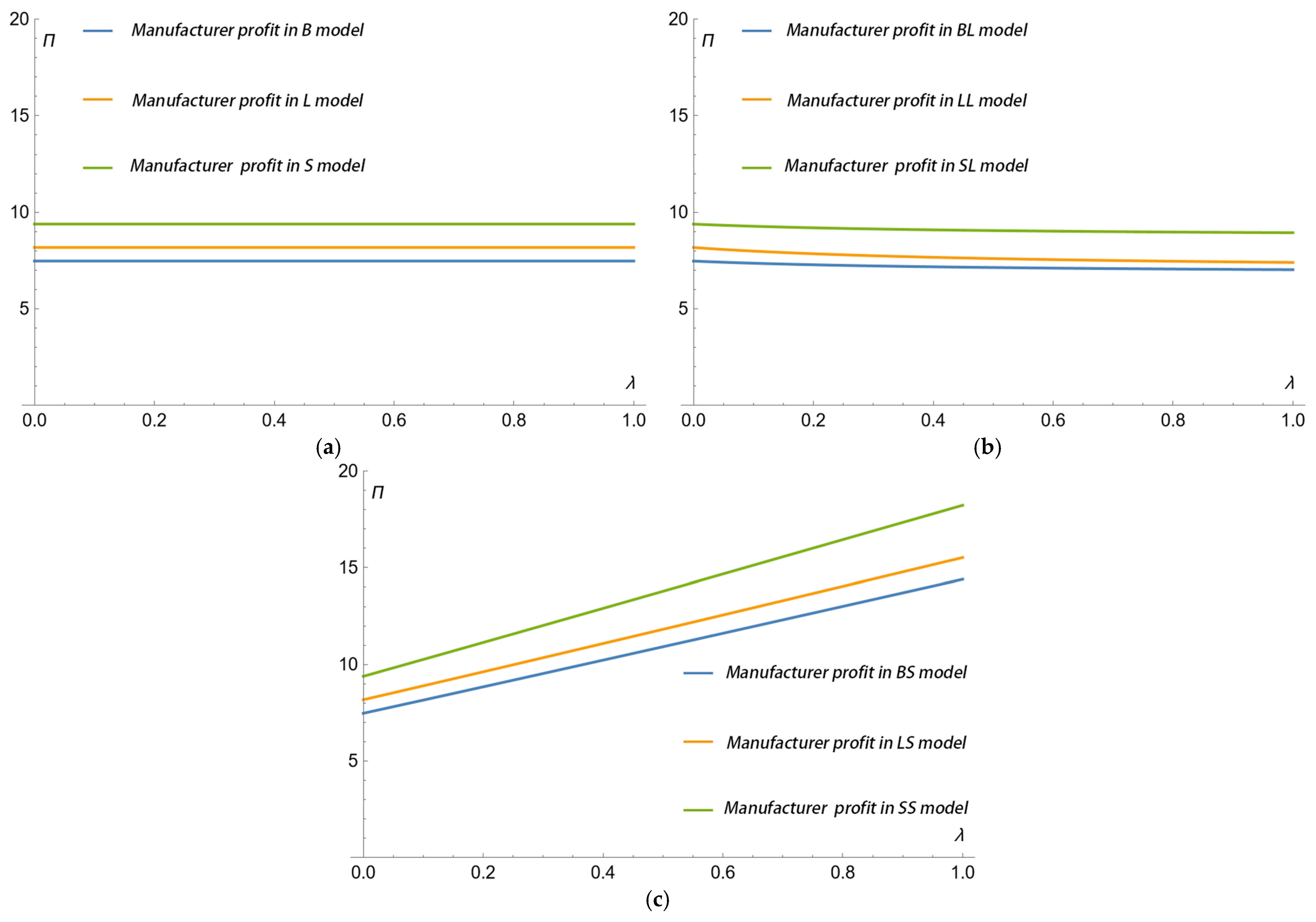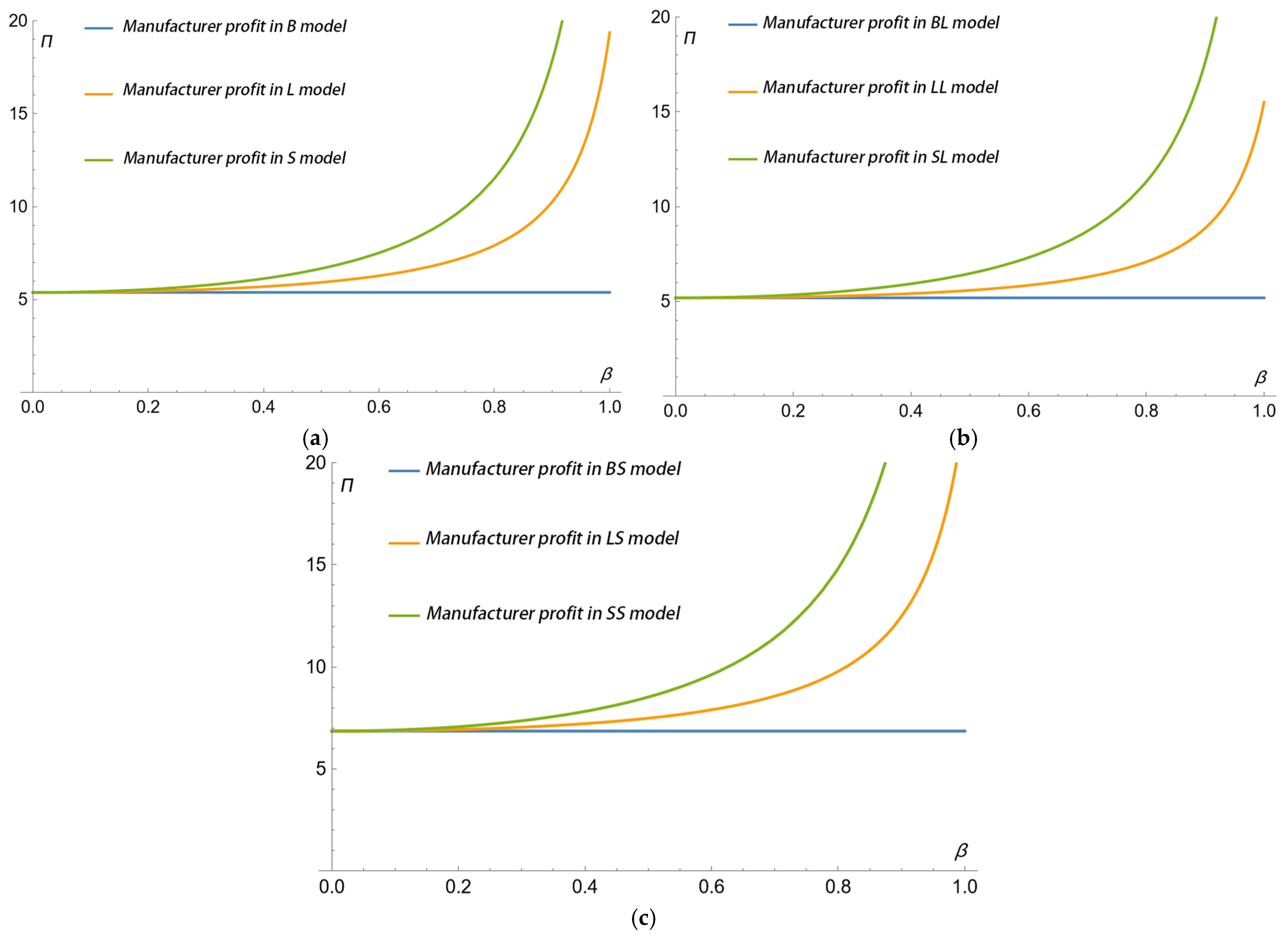 Proposition 1. In the B, BL, and BS models, has a positive impact on , , and . In the BL model, has a positive impact on , and has a negative impact on manufacturer profits.