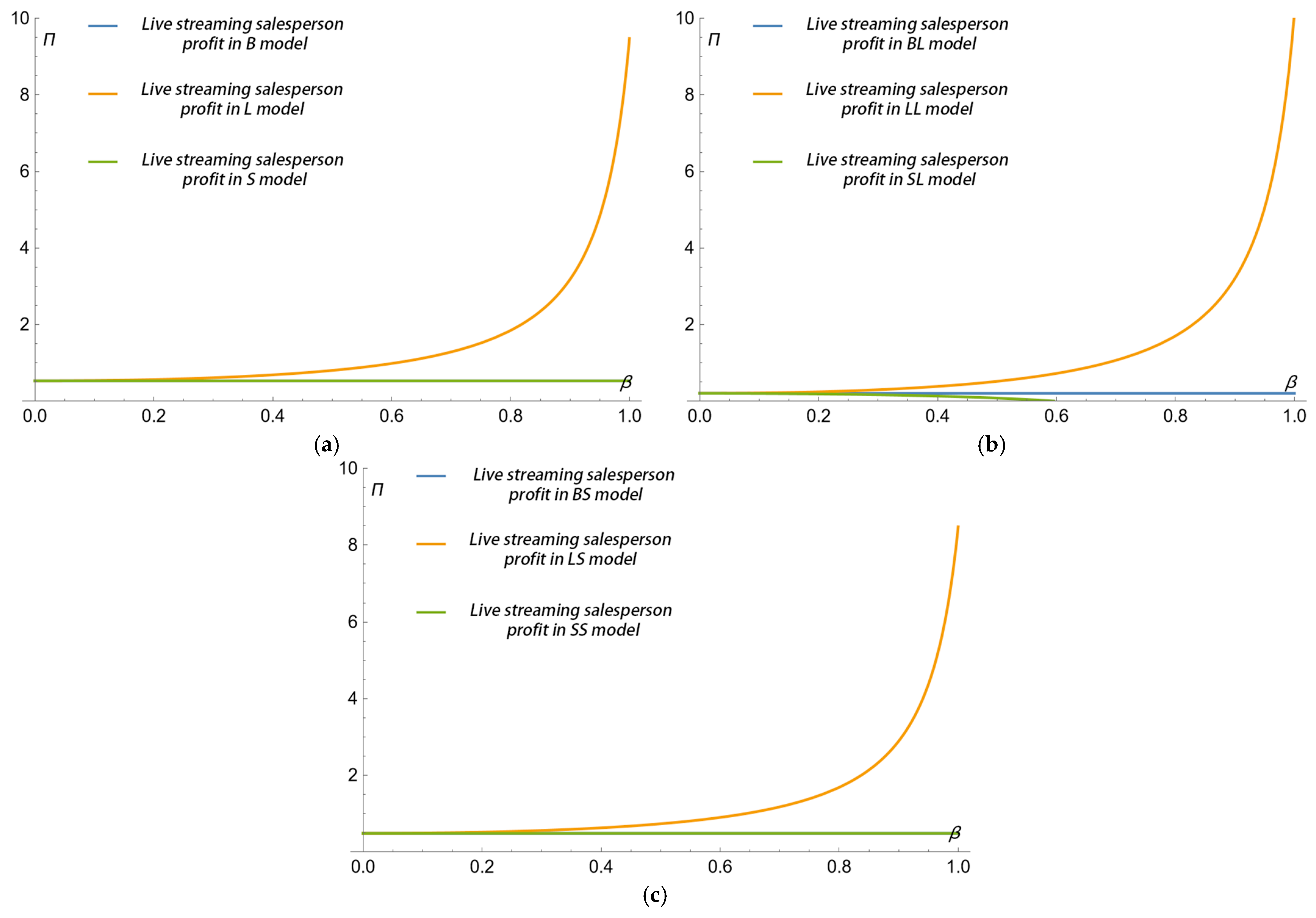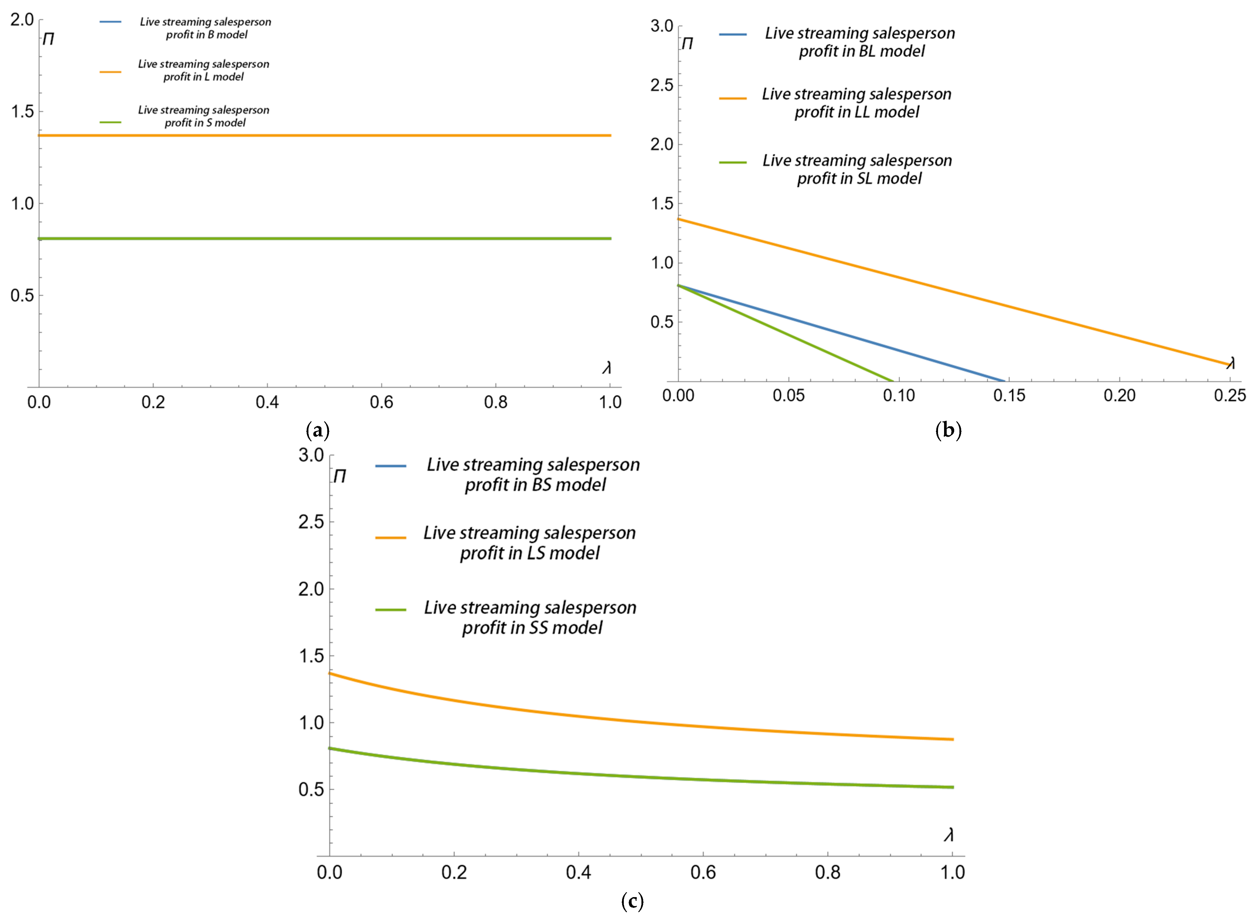 Proposition 3. In the S model, b has a positive impact on , , and . In the S, SL, and SS models, has a positive impact on supplier profits, and the coefficient of after-sales effort cost has a negative impact on supplier profits. In the SL model, has a negative impact on supplier profits, and in the SS model, has a negative impact on the live streaming salesperson profits.