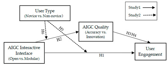 How human–AI interactive interfaces affect user engagement with AIGC platforms is a critical underexplored issue. Grounded in signaling theory, this paper constructs a theoretical model to examine the differential effects of two interactive interfaces—modular versus open—on user platform engagement, the mediating role of AIGC quality, and the moderating role of user type. Through two scenario experiments, our findings reveal that both AI interactive interfaces (open and modular) significantly enhance user platform engagement, with the open interface exhibiting a stronger effect. Specifically, AIGC accuracy serves as a mediator in the relationship between modular interfaces and user engagement, and innovativeness plays a mediating role in the relationship between the open interface and users’ engagement. Furthermore, novice users strengthen the effect of open AIGC interfaces on AIGC innovation and subsequent engagement, Non-novice users amplify the positive impact of modular AIGC interfaces on both AIGC accuracy; however, there is no significant difference for user engagement. These findings theoretically enrich the customer response model in the literature on human–computer interactions and provide actionable insights for AIGC platform enterprises. By designing tailored interactive interfaces, platforms can generate high-quality, user-perceived AIGC for diverse customer segments. This study offers both theoretical contributions and practical implications for the development of AI-driven user engagement strategies. Full article