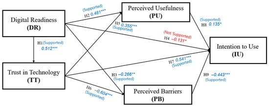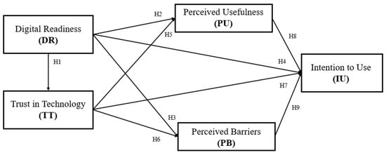 Beyond technical competence, digital readiness (DR) encompasses openness to innovation and a proactive attitude toward adopting new technologies [17,44]. Such dispositions lower psychological resistance to new systems, accelerate initial learning and adaptation, and reduce uncertainty during use [21]. As a result, even before specific evaluations of perceived usefulness (PU) or perceived barriers (PB) are formed, users with high DR face a lower threshold for trying new technologies and are more inclined to explore novel features or interfaces. This behavioral openness and reduced anxiety directly strengthen their intention to adopt the technology [5].