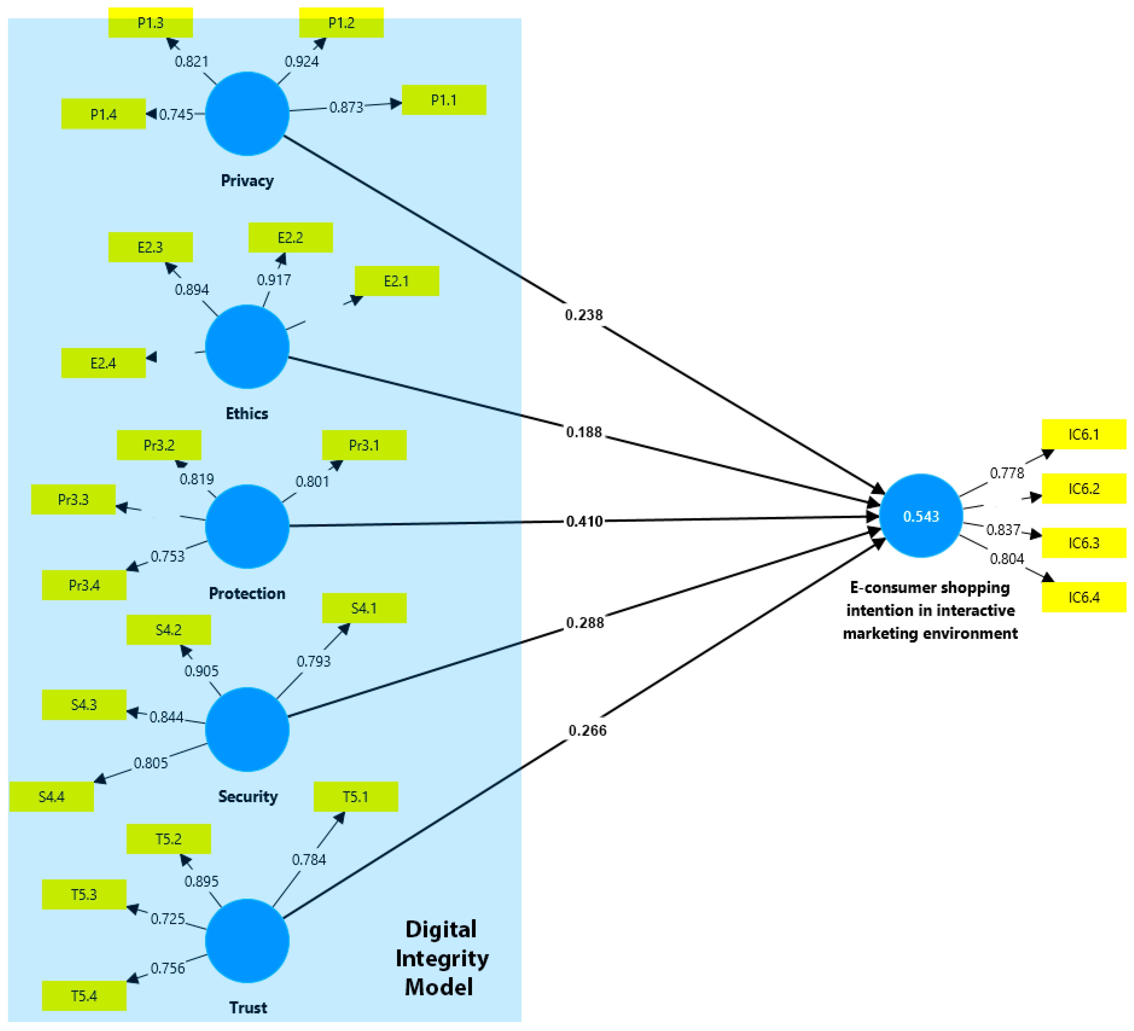 H1 | Ethics → E-consumer shopping_intention in interactive marketing_environment | 0.238 | 0.039 | 0.410 | 2.525 | 0.012 | Supported |