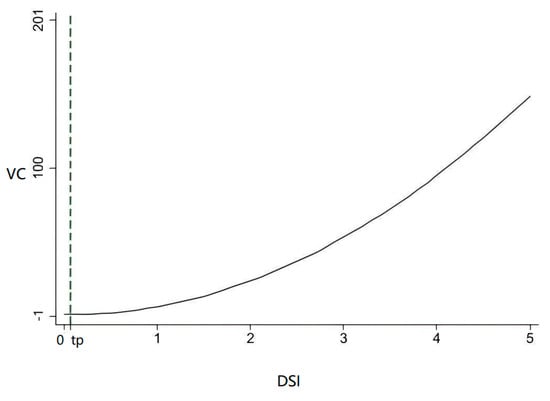 To examine the nonlinear effect of digital service innovation (DSI) on value creation, we estimate a two-way fixed-effects model. The regression results are presented in Table 2. Meanwhile, Figure 2 illustrates the nonlinear relationship between digital service innovation and value creation. The coefficient on the linear term of DSI is −0.8801 and on the squared term is 6.1482; both coefficients are statistically significant at the 5% level. Using Equation (3), the estimated inflection point is 0.0161, which lies within the observed range of DSI. The negative linear coefficient combined with the positive quadratic coefficient implies that when DSI is below 0.0161, its marginal effect on value creation is negative; once DSI exceeds this threshold, the marginal effect becomes positive and grows as DSI increases further. This confirms a U-shaped relationship between digital service innovation and value creation in the sample of manufacturing firms.