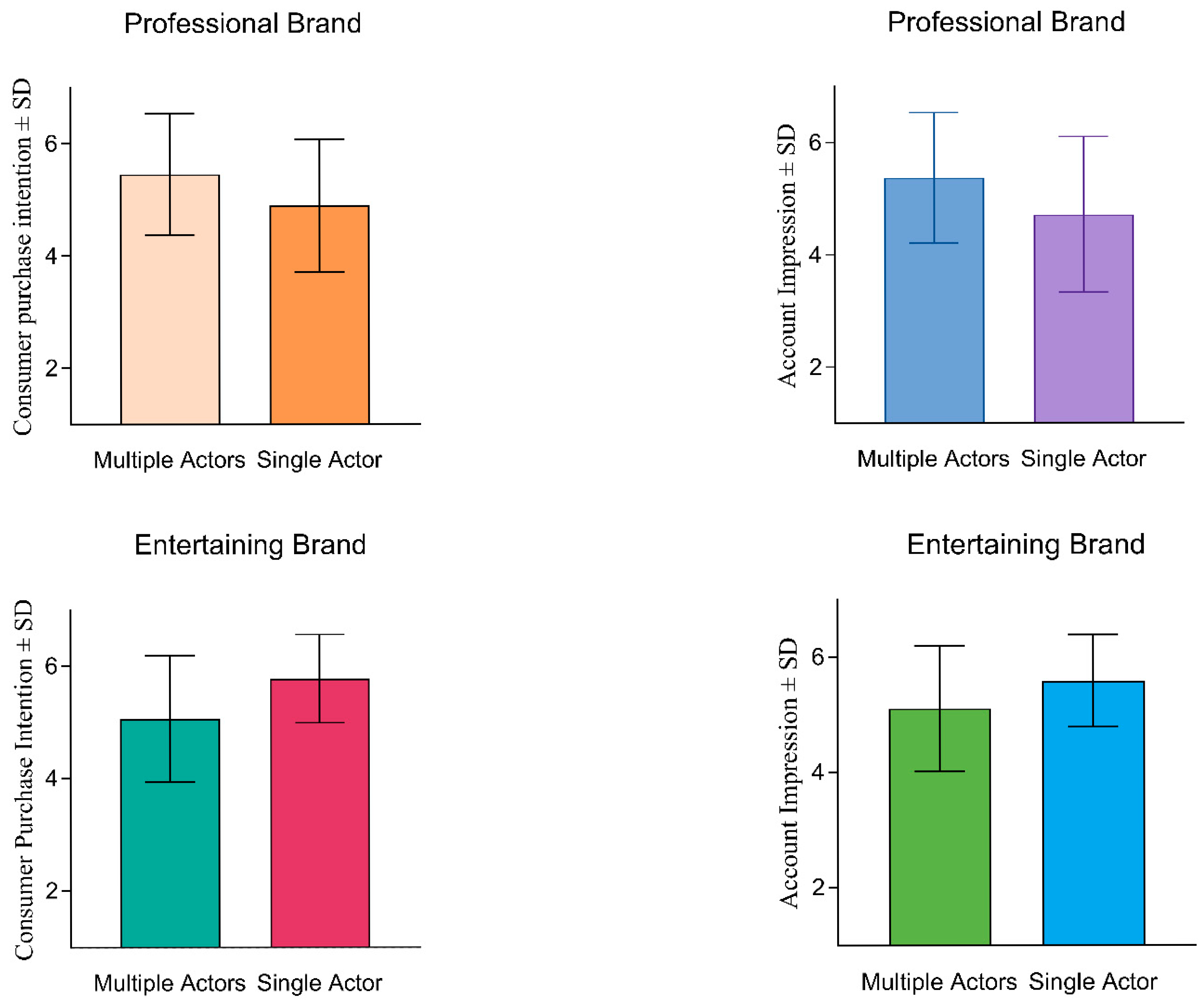 H7. Brand type moderates the effect of a one-actor/multi-role casting strategy on (a) purchase intention and (b) positive account impressions: the strategy is more effective for entertaining/exciting brands than for serious/competence-oriented brands.