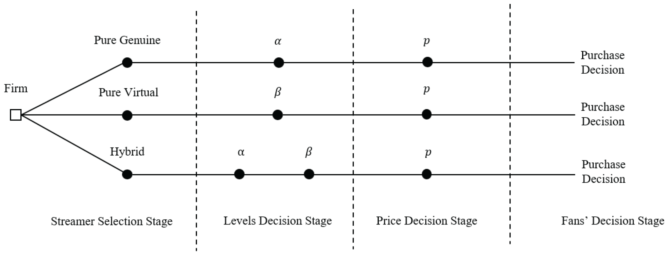 - Hybrid Streamer Option. Finally, the firm can hire both genuine and virtual streamers simultaneously. In this situation, the main role of the virtual streamer is to carry out live streaming sales activities when the genuine streamer is resting. This combination is mainly aimed at covering all fans and enabling efficient interactions during live sales. However, at the same time, the firm has to bear the corresponding costs of both types of streamers.