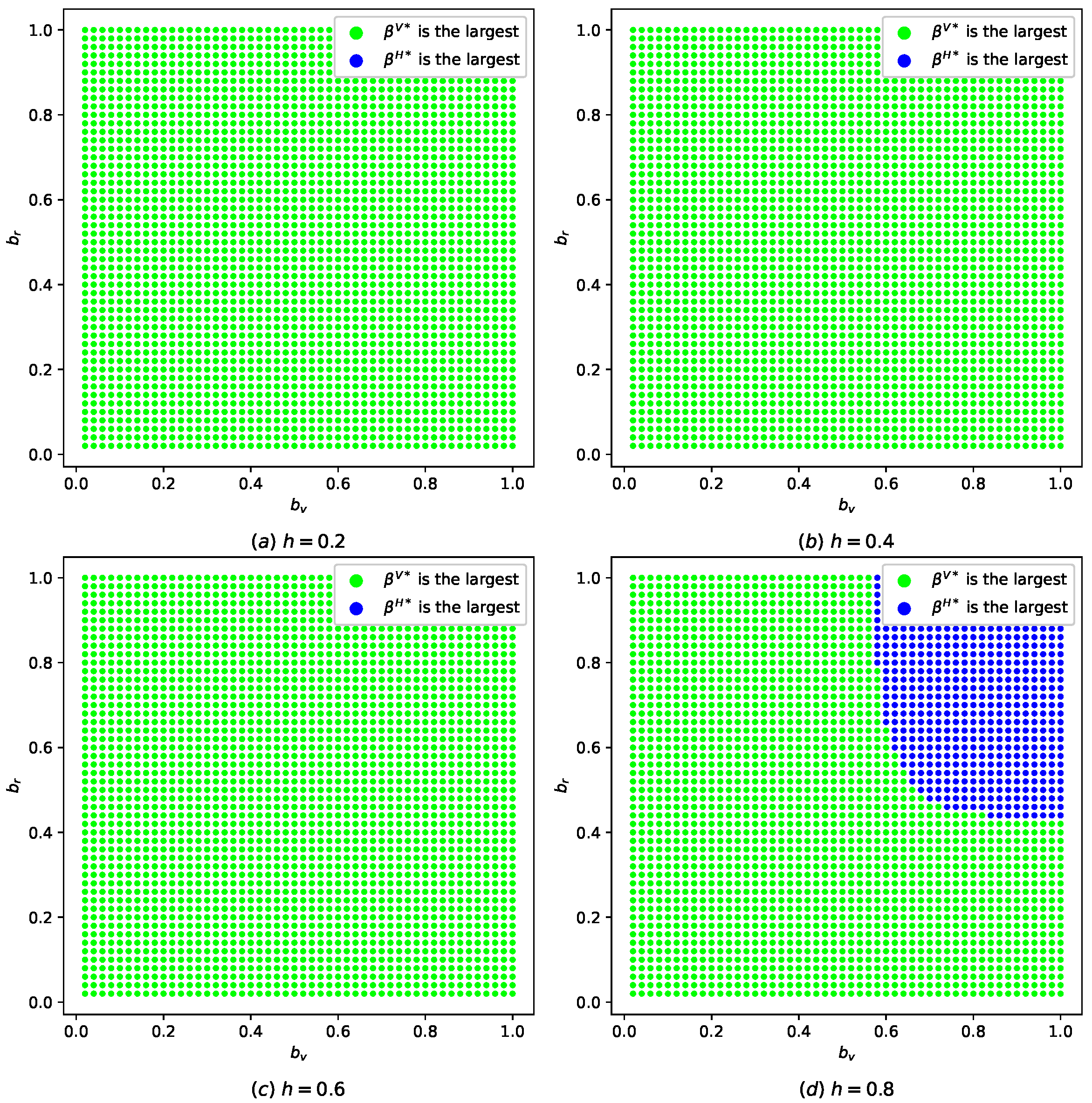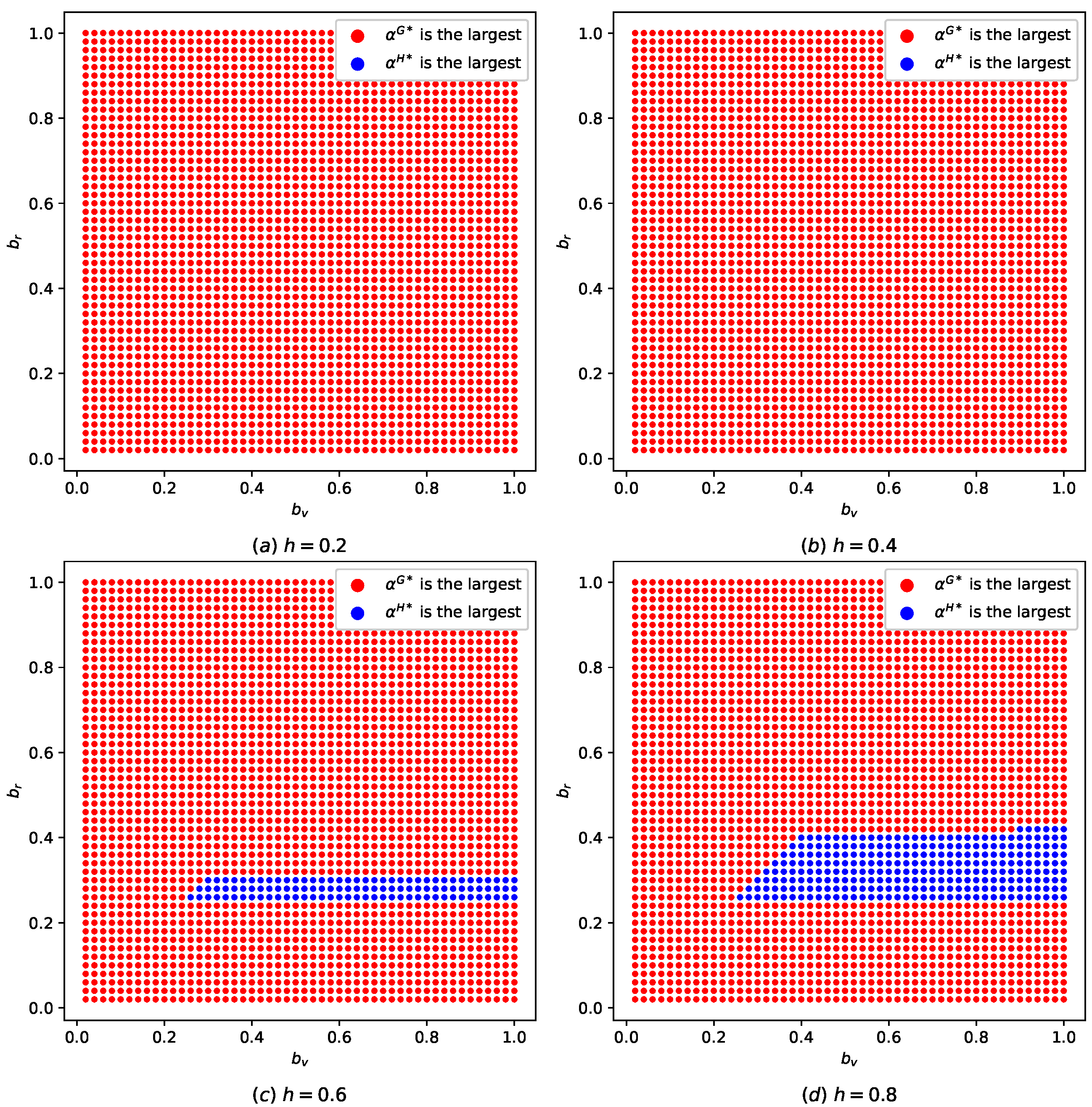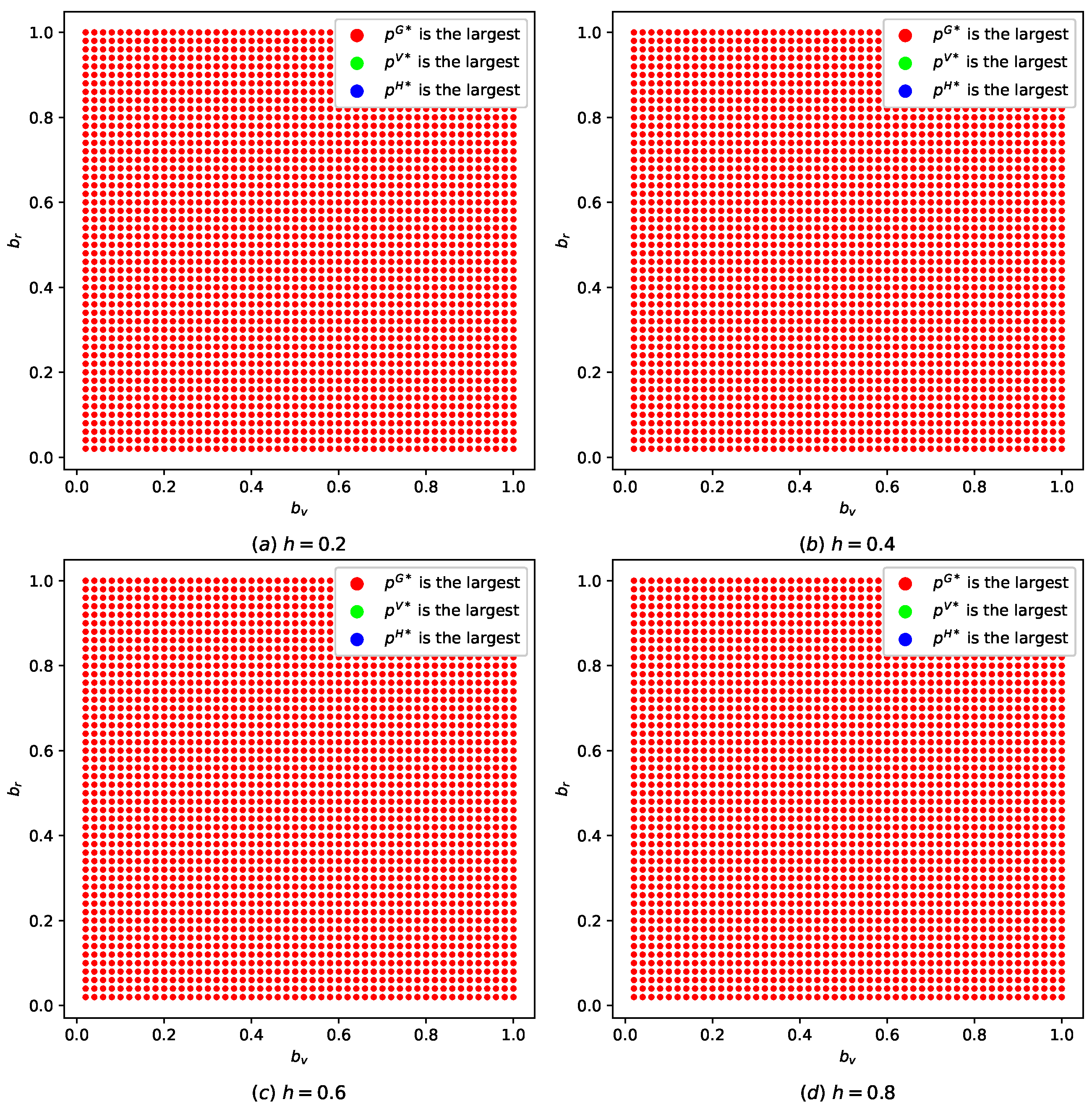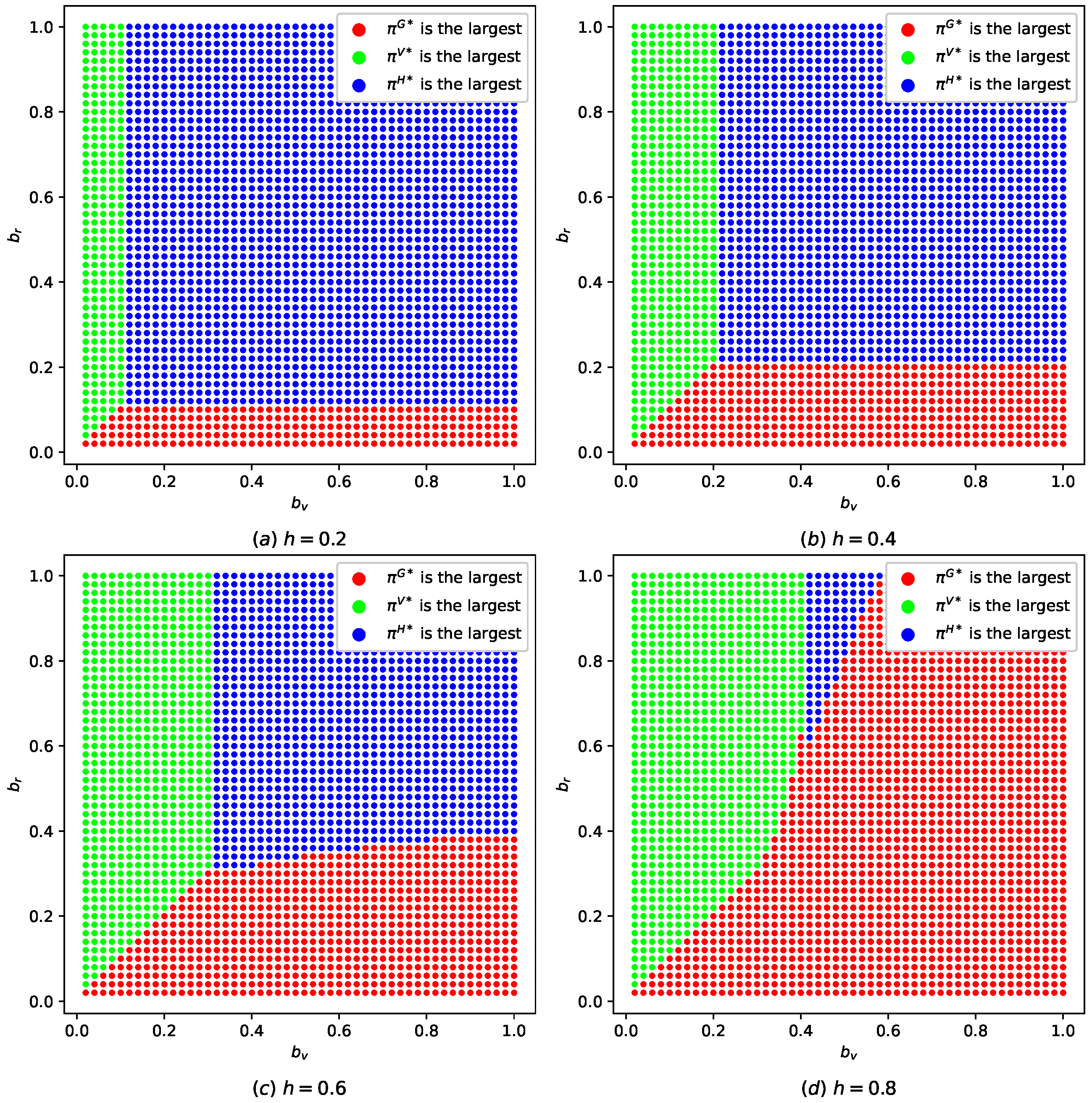 - if h is not too large then (a) if is sufficiently small and is not too small then is the largest and, thus, the firm prefers to hire a pure genuine streamer, (b) if is sufficiently small and is not too small then is the largest and, thus, the firm prefers to hire a pure virtual streamer, (c) if and are not too small simultaneously then is the largest and, thus, the firm prefers to hire both types of streamers;
