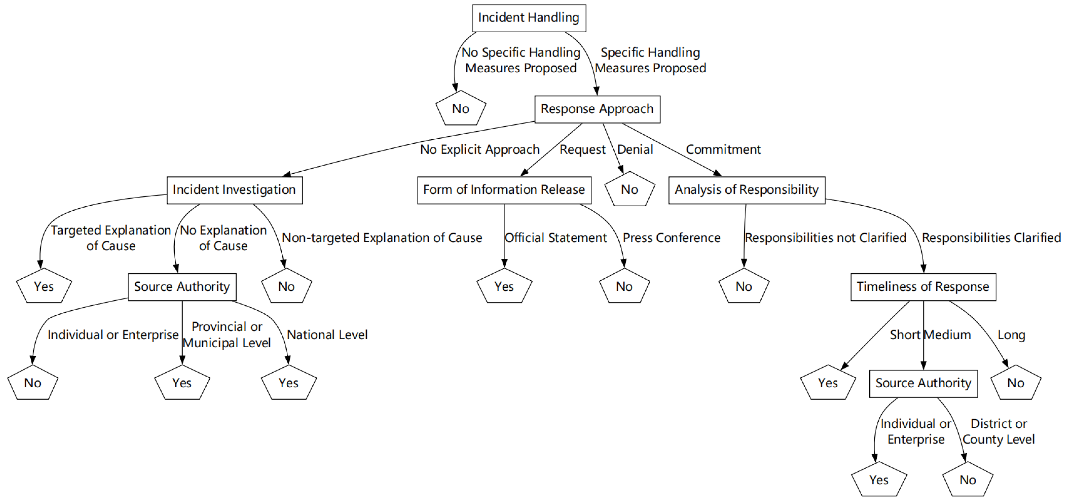 44], crisis response approaches can be divided into denial, diminish, and rebuild. Based on these findings, this study measures the attitude of the response in terms of the timeliness of response and the response approach. The value criteria are listed in