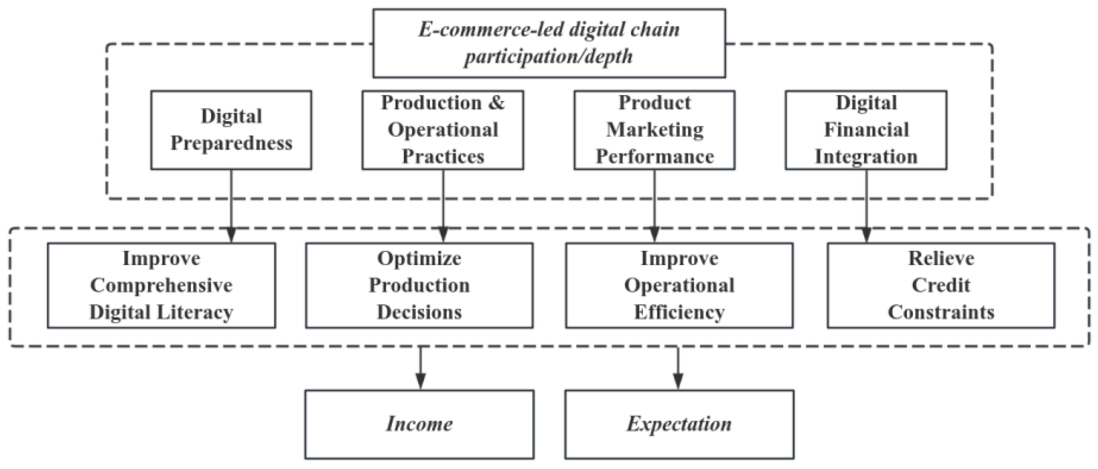 Figure 1). Together, these dimensions promote continuous improvements in production efficiency, market responsiveness, and resource allocation. By strengthening both individual digital engagement and value-chain integration, these mechanisms generate endogenous momentum for sustained income growth among rural households.