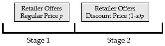 We do not adopt the model in which retailers set a lower initial price and increase it later. First, internet-savvy consumers usually search for all deals available before making purchases [45]. Since these consumers experience a high searching cost, they are eager to pay a lower price. Second, it is consistent with most of our observations that retailers set regular prices first and provide a discount later. Figure 1 below presents our model framework.