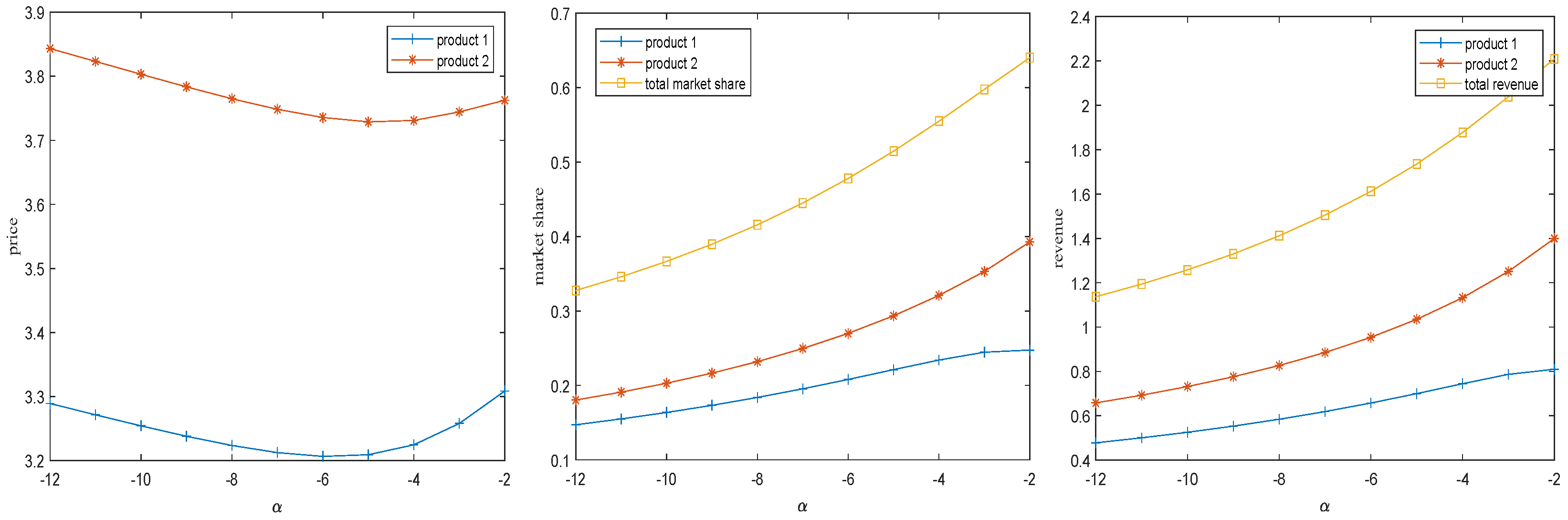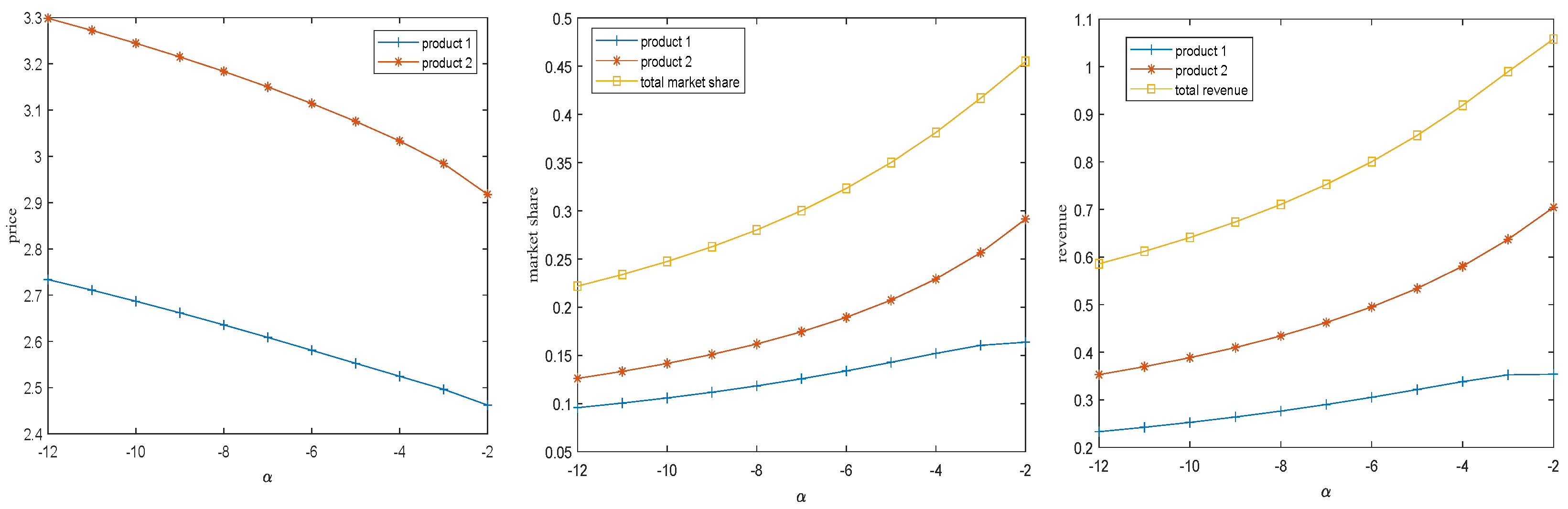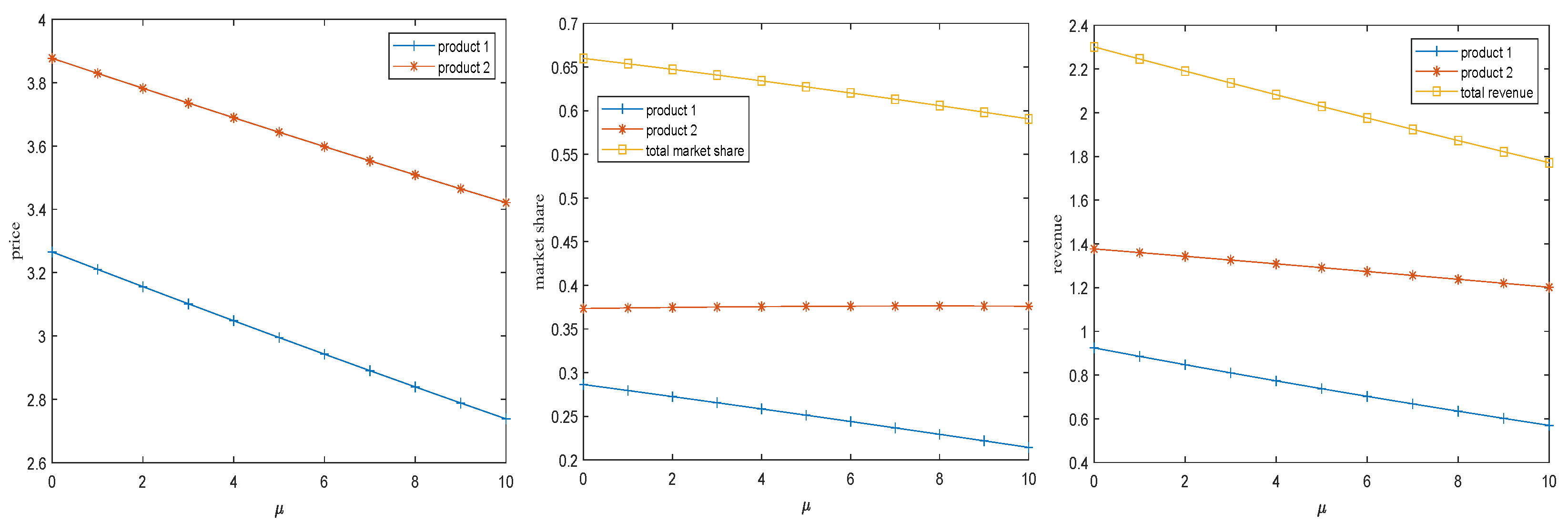 Figure 3, when value-added services are provided, it can be observed that both the optimal market share and optimal profit increase with the network effect parameter, while the price initially decreases and then increases. When there are no value-added services, enterprises counteract negative network effects by continuously reducing prices, thereby achieving growth in market share and profits. Relatively speaking, the presence of value-added services indicates that the strategy has become completely different, and enterprises no longer need to blindly lower prices. When the negative network effect parameters increase to a certain extent, enterprises can even start to raise prices while still continuing to expand their market share and profits. Therefore, through the strategic innovation of providing services, the traditional single pricing model can be transformed into value-oriented differentiated pricing, and the impact brought by negative network effects can be reduced, achieving comprehensive growth in pricing power, market share, and profits.