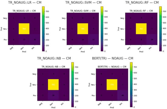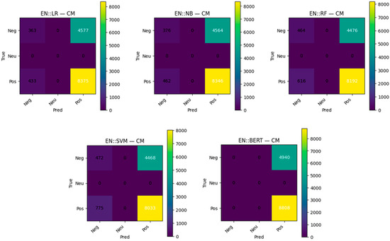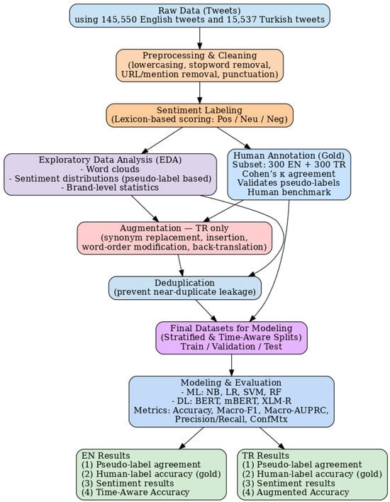 In the study, ML and BERT models, recognized in the literature for achieving the high accuracy values in sentiment analysis, were applied to the datasets. While Scikit-learn and TensorFlow were used to build ML models, Keras (running on TensorFlow) was employed for DL models. The Transformers library, which contains pre-trained models for various NLP tasks, was used to fine-tune these models. Pseudo-labels were complemented with a human-annotated gold standard, and a transparent error audit was conducted, focusing on known failure modes in social media data including code-mixing, sarcasm or irony, and culturally anchored idioms. For the lower-resource Turkish subset, conservative data augmentation strictly for training (with leakage safeguards) was adopted to stabilize learning without artificially inflating test performance.
