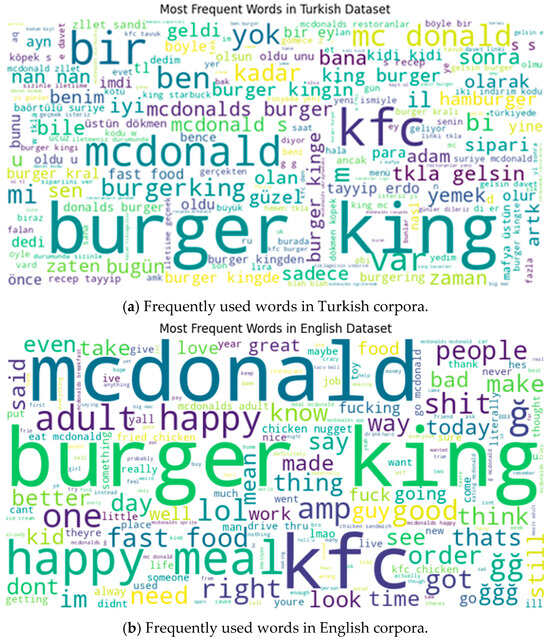The dataset [43] was collected from three major brands, McDonald’s, Burger King, and KFC, which are ranked among the top 25 most valuable restaurant brands in the food sector according to Brand Finance Turkey’s 2022 Report. The English dataset was collected over one month, from 9 September 2022 to 9 October 2022, yielding 145,550 English tweets. The Turkish dataset was gathered over a more extended period, from 6 August 2022 to 1 January 2023, resulting in 15,537 Turkish tweets.