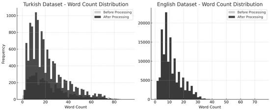 Figure 3 illustrates the word count distribution in Turkish and English datasets before and after pre-processing. In both datasets, pre-processing substantially reduced noise and standardized the input length, critical for enhancing model efficiency and interpretability. The Turkish dataset showed shorter average word lengths, indicating more concise expression patterns typical of social media platforms in low-resource languages.