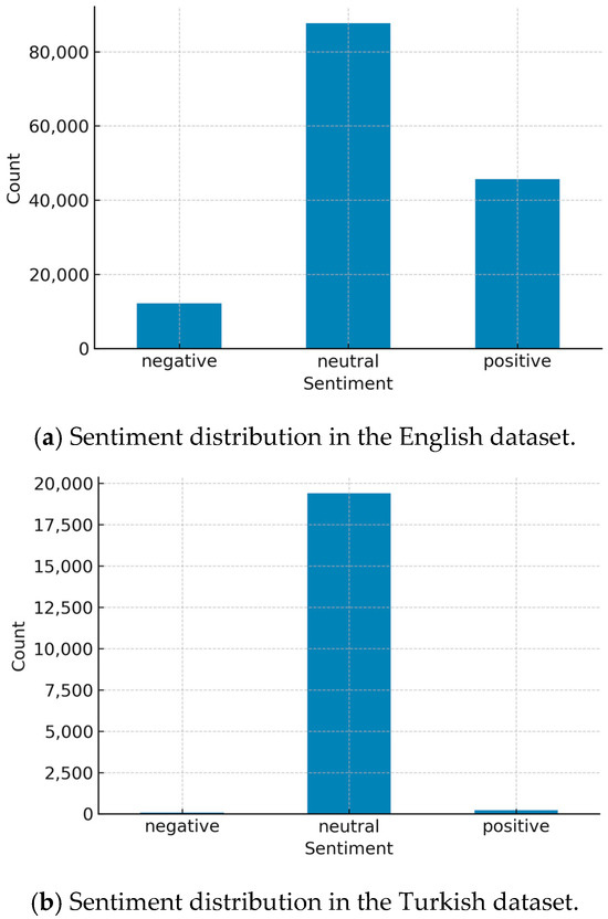 Figure 4 presents the sentiment distributions of the two datasets. Figure 4a shows that the English dataset exhibits a relatively diverse sentiment structure. Although neutral tweets dominate, there are also substantial proportions of positive and negative sentiments. This indicates that English tweets tend to be more balanced regarding emotional expression, with a considerable proportion of the content being informative or evaluative rather than overtly emotional. In contrast, Figure 4b shows that the Turkish dataset is overwhelmingly skewed toward the neutral class, with very few positive or negative tweets. This strong concentration in the neutral category highlights the limitations of lexicon-based approaches in capturing sentiment in Turkish, which may stem from its morphological richness, contextual dependencies, and implicit sentiment expressions.
