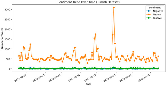 A time-series analysis was conducted for the Turkish dataset to gain a deeper understanding of sentiment dynamics over time (Figure 5). The results show fluctuations in tweet volume, particularly for neutral sentiment, which often spiked during specific periods. These peaks may correspond to promotional campaigns, service-related discussions, or viral events. While positive and negative sentiments remained relatively stable, the increased volume of neutral tweets indicates heightened brand-related discourse without explicit emotional expression. Per-tweet timestamps were not retained for the English corpus; therefore, time-series analysis was conducted only for Turkish (Figure 5).