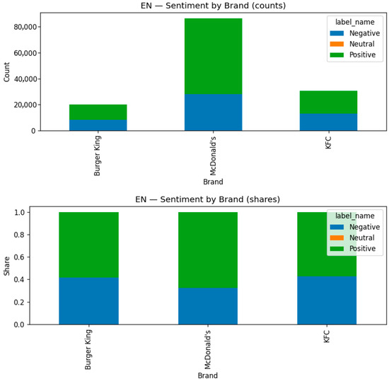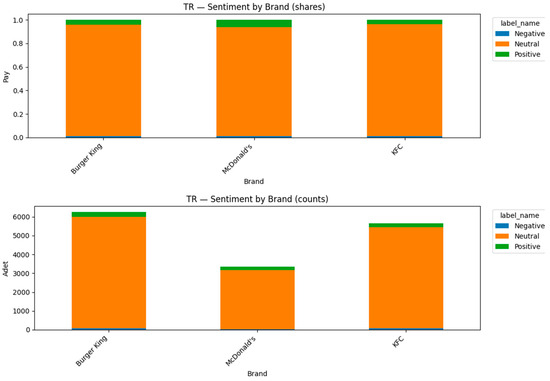 Figure 6 (English) shows brand names normalized (“Burger or Burger King” → Burger King; “Mc or Mc Donald(s)” → McDonald’s). McDonald’s has the most significant volume and the highest positive share (≈0.68), while Burger King and KFC display higher negative shares (≈0.41–0.43) with positives around 0.57–0.59. Figure 7 (Turkish) is dominated by Neutral sentiment across all brands (≈95–97%), with Positive ≈ 3–4% and Negative ≈ 0.5–1%. In Figure 6, the Neutral class is omitted for visual comparability; therefore, the shares reflect only the Negative–Positive axis. The small between-brand differences in Turkish primarily reflect the overwhelming Neutral class.