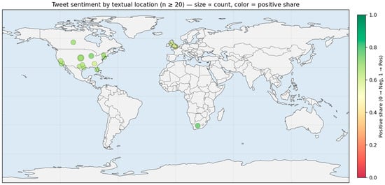 Figure 8 visualizes the English dataset’s verbatim textual-location groups (threshold n ≥ 20). Bubble size is scaled by √n, and color encodes the share of positive sentiment (0 → red = negative, 1 → green = positive). Only user-provided textual locations with sufficient support are included; consequently, the map represents a subset of users who self-disclosed locations and should not be generalized to the full population. Small cells (n < 20) are suppressed for privacy and stability. The map exhibits pronounced clusters across the United States (particularly the West and Southeast), Canada, the United Kingdom, and South Africa. Positive shares in these centers typically range from ~0.60 to ~0.76 (e.g., South Africa ≈ 0.758; Chicago, IL ≈ 0.723; Los Angeles, CA ≈ 0.675), while negative shares generally fall between ~0.28 and ~0.40. Because neutral tweets were not included in textual-location aggregation (see Table 1 notes), neutral shares are effectively negligible by construction in these displays. General labels such as “United States” and “USA” are retained as distinct groups to reflect users’ self-described locations.