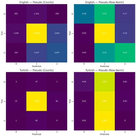 When evaluated against lexicon-derived labels, the models achieved very high agreement. Figure 9 presents the confusion matrices. In the English dataset, pseudo-label agreement reached Accuracy = 0.964, Precision = 0.943, Recall = 0.933, and F1 = 0.938 (n = 41,770). The Turkish dataset’s performance was similarly high with accuracy = 0.995, Precision = 0.920, Recall = 0.775, and F1 = 0.834 (n = 12,003).