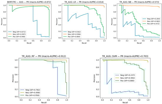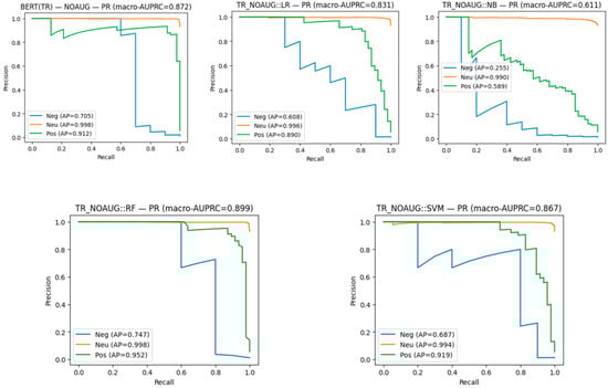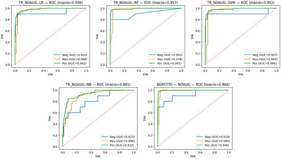Figure 16 displays ROC curves for all models. High discriminative ability is maintained overall, with macro-AUC approximately 0.97 for BERT, 0.96 for LR, 0.95 for RF, 0.94 for SVM, and 0.82 for NB. While LR and SVM appear competitive by ROC, their minority-class behavior remains weaker when judged by PR and confusion matrices—underscoring that ROC can overstate performance under extreme class skew. BERT’s advantage is plausibly attributable to its contextual representations, which better capture nuanced sentiment expressions; nevertheless, the remaining gap in minority-class recall indicates an intrinsic effect of imbalance rather than overfitting.