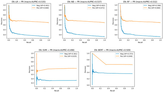 To ensure comparability and computational feasibility, all English models were trained under a leakage-controlled protocol (early→late split; GridSearchCV with 3-fold stratification for ML). As detailed in Methods, SVM retained the pre-defined grid (C∈{0.1,1,10}, kernel∈{linear, rbf}) but disabled probability estimation; PR/ROC curves were derived from min-max-normalized decision_function scores, with cache_size = 2000 and max_iter = 2000. The search was restricted to the linear kernel for very large training sizes.