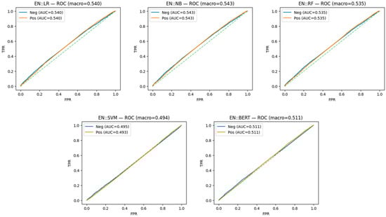 Figure 18 (class-wise PR) indicates macro-AUPRC near chance for all models (~0.50–0.54); average precision is consistently higher for Positive (≈0.64–0.67) than for Negative (≈0.36–0.40). Figure 19 (ROC) shows macro-AUC values around 0.50 (LR 0.540; NB 0.543; RF 0.535; SVM 0.494; BERT 0.511), confirming limited separability under a realistic temporal holdout. The figure compares ROC curves for five models (LR, NB, RF, SVM, and BERT), with macro-AUC values ranging from 0.494 to 0.543. The green dashed line represents the random classifier baseline (AUC = 0.5) and is now explicitly included in the legend for clarity. Each subplot shows the ROC performance for the negative and positive sentiment classes under the time-aware evaluation setting.