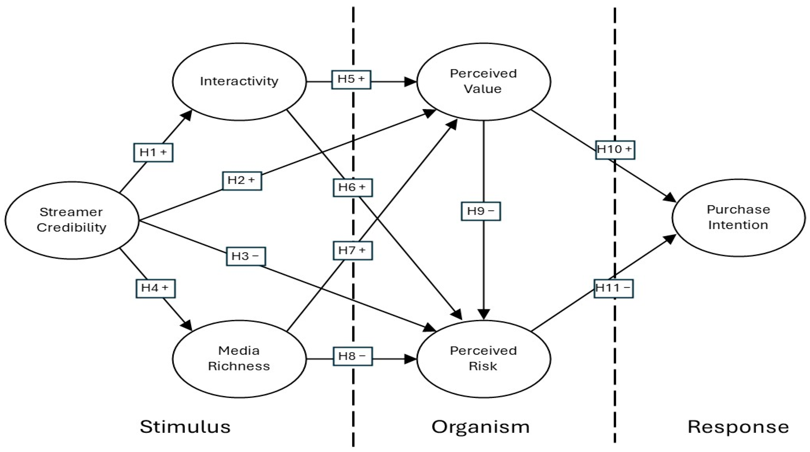 RQ1. How do credibility, interactivity, and media richness shape consumers’ perceived value and perceived risk in live-streaming commerce?RQ2. How do perceived value and perceived risk influence users’ purchase intentions?