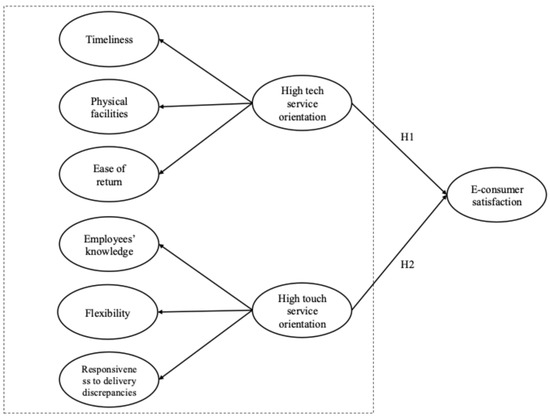 The second-order construct of high-tech orientation was reflected in three dimensions: timeliness, physical facilities, and ease of return. Conversely, high-touch orientation comprised employees’ knowledge, flexibility, and responsiveness to delivery discrepancies.